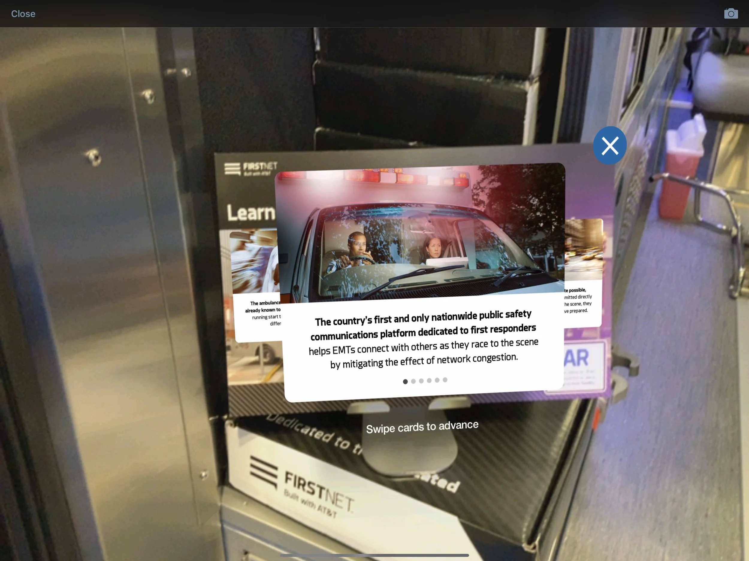 Printed targets in various sizes were placed around an ambulance to connect the ambulance to the FirstNet story. Content was viewed using Bigtincan’s Augmented Reality viewer.